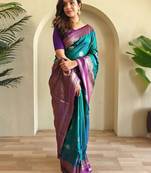 The saree features a stunning contrast pallu in purple with intricate geometric zari work. The design radiates sophistication, making it ideal for weddings, celebrations, or cultural gatherings.