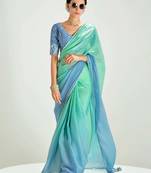 This elegant blue shaded organza tissue saree beautifully transitions from sea green to sky blue hues. The delicate heavy work border and butta enhance its luxurious appeal, perfect for festive occasions.
