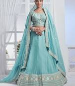Make a lasting impression with this stunning sky-blue organza lehenga choli set, featuring intricate multi-embroidered work and sequin detailing. The semi-stitched lehenga can be customized up to 42 inches, while the choli comes with unstitched material for a perfect fit. Complete the look with the matching organza dupatta, adorned with designer lacework for an elegant finish. Perfect for weddings, receptions, and special occasions, this outfit is sure to turn heads. Elevate your style with a chic bun and a pair of heels for a show-stopping ensemble. Disclaimer: slight color variation may occur due to photographic reasons.