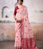 This elegant cotton saree comes in a soft blush pink hue adorned with subtle woven motifs throughout the body. The intricate weaving work lends a traditional yet contemporary appeal to the ensemble, perfect for festive and formal occasions.
