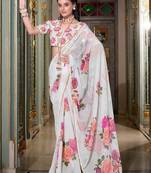 Step into elegance with this white georgette saree, showcasing a soft floral print and a graceful drape. The 5.5-meter fabric is lightweight and breathable, perfect for festive and formal settings.