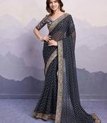 Make a bold ethnic statement with this striking black georgette saree, adorned with delicate Bandhani prints all over. The saree is elevated with intricately embroidered borders, adding a regal touch to its graceful drape.