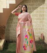Signature Paithani Design: Known for its intricate peacock, floral, and geometric motifs woven with zari.