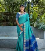 • Saree : Color- Turquoise / Fabric- Art Silk • Blouse : Color- Blue / Fabric- Art Silk Saree Details