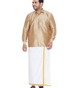 • Product Id : 3936377 • Package Details : 1 Shirt/1 Mundu • Type : Dhoti Kurta • Work : Plain • Look : Traditional • Sleeve : Full Sleeve • Top Color : Gold • Top Fabric : Silk Blend • Stitching : Stitched Payments [+]
