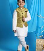 Boys' Yellow And White Jacket, Kurta And Pyjama Set