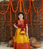 • Product Id : 4465648 • Package Details : 1 Top / 1 Lehenga • Type : Pattu Pavadai Set • Occasion : Casual • Work : Woven • Look : Traditional • Sleeve : Half Sleeve • Neck Style : Round Neck • Bottom Color : Mustard • Top Color : Maroon • Chunari Color : Yellow • Top Fabric : Silk Blend • Bottom Fabric : Silk Blend • Chunari Fabric : Silk Blend • Stitching : Stitched • Gender : Girl Payments [+]