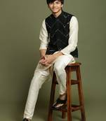 Fabric: Viscose | Contents: A Mirror Work Viscose Sleeveless Nehru Jacket. The set contains a kurta and pyjama that compliments the color of the jacket. Mirror Work Viscose Sleeveless Nehru Jacket. The set contains a kurta and pyjama that compliments the color of the jacket. We manufacture kids wear for boys in size 32 (9-10 Years),32L (10-11 Years),34 (11-12 Years),34L (12-13 Years),36 (13-14 Years),36M (14-15 Years),36L (15-16 Years),36XL (16-17 Years) All our kurtas, Sherwani, Indowestern and Nehru Jackets have loosening over the body measurement. Measurements shown in images or the size chart section are garment measurements, so take adequate 5-6 inches loosening over the little champion's body measurement to get the right fit. Our kurtas are Medium length and Regular Fit. Our Kurta fitting is usually slightly relaxed compared to a Regular Shirt's fitting. Select your Kurta size based on your chest dimension. Suitable for: Party, Weddings, Regular Wear, Celebrations, Occasions, Festivals, Lohri, Pongal, Makar Sakranti, Baisakhi, Holi, Eid, Raksha Bandhan, Dussehra, Diwali, Navratri, Pooja, Christmas, Onam, Ganesh Chaturthi, Janmasthmi and Gifts for Boys Wash Care Instructions: Dry Clean preferably or cold light wash. Disclaimer: We have made a consistent effort to make the colours and finishes similar to the image of the products you see on screen. However, the actual product and the images on the website can differ! Customer's discretion is advised.