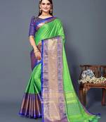 • Saree : Color- Parrot Green / Fabric- Silk Blend • Blouse : Color- Blue / Fabric- Silk Blend Saree Details