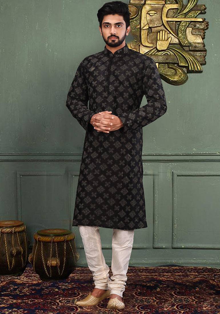 If you find the product for less we'll match it! Know MoreBLACK DUPION ART SILK KURTA WITH COMPUTERISED EMBROIDERY MACHINE WORK CHURIDAR