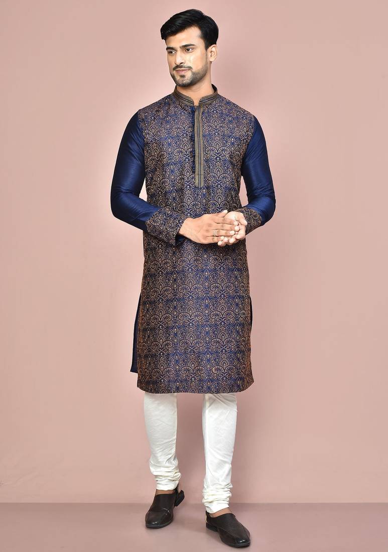 If you find the product for less we'll match it! Know MoreNAVY BLUE DUPION ART SILK KURTA WITH COMPUTERISED EMBROIDERY MACHINE WORK CHURIDAR