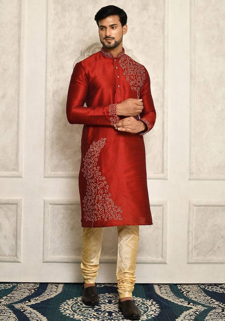 Red Dupion Art Silk Kurta With Computerised Embroidery Machine Work Churidar