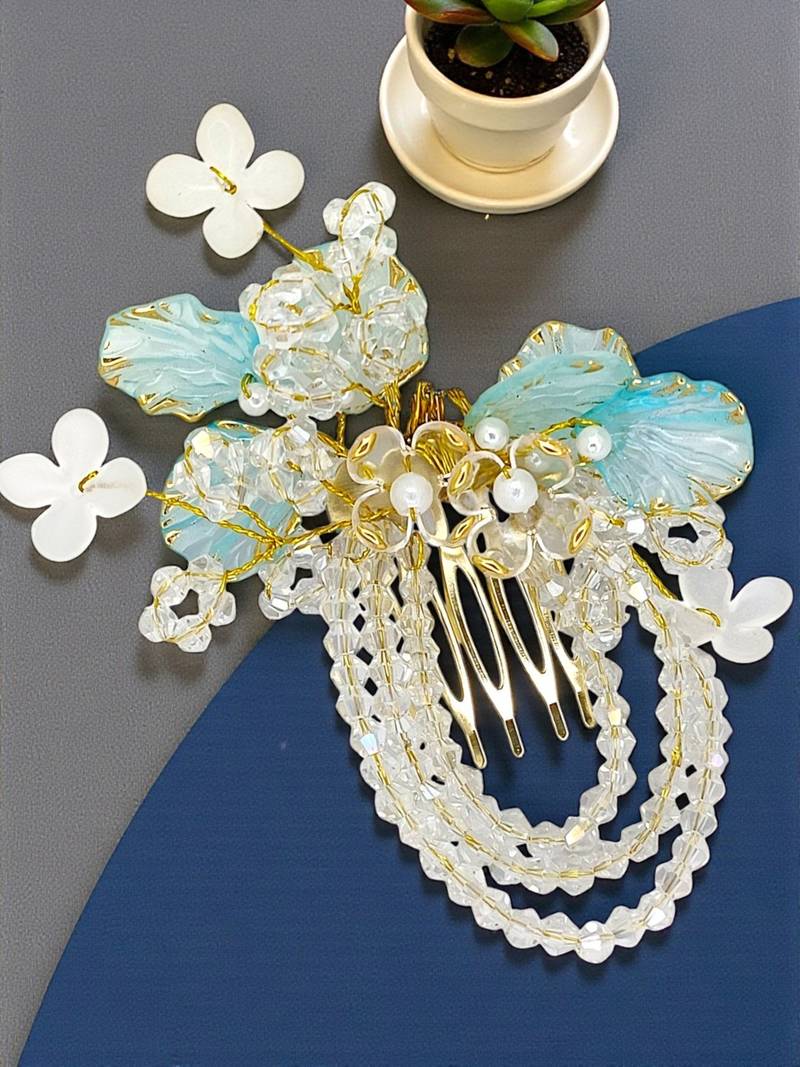 •Soft Sky Blue Hue: The subtle sky blue color adds a refreshing and graceful touch to any hairstyle. Sparkling Crystal Beads: Adorned with crystal beads that create a shimmering and radiant effect. Charming Butterfly Accent: Includes a butterfly embellishment for a whimsical and stylish finish.