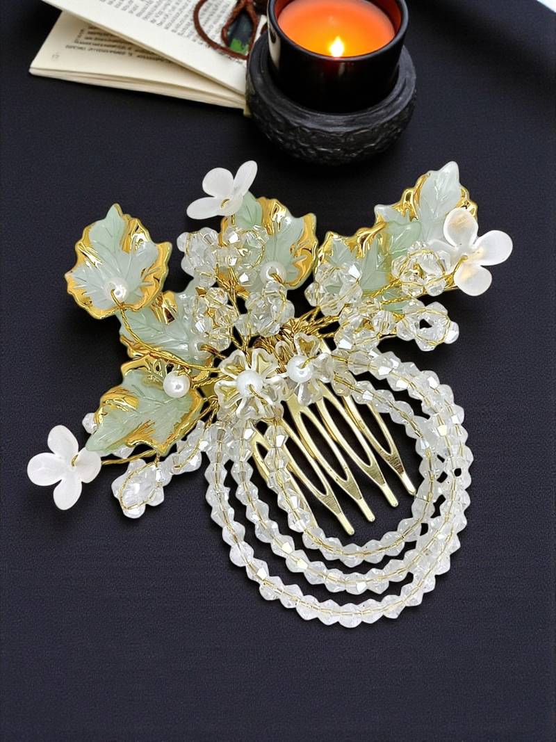 •Elegant Floral Design: Gold-toned comb hair pin featuring a light green floral pattern for a delicate and feminine look.