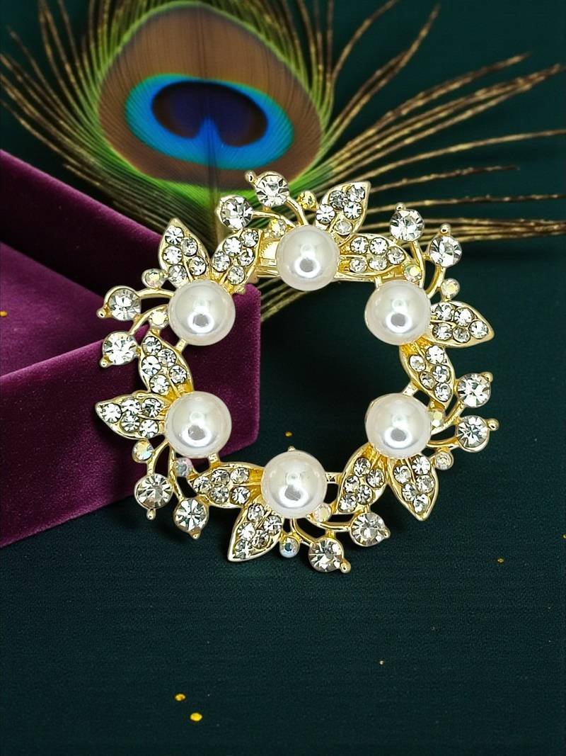 Gold toned floral design wreath saree pin, studded cubic zircon and beads. Secured with pin closure.