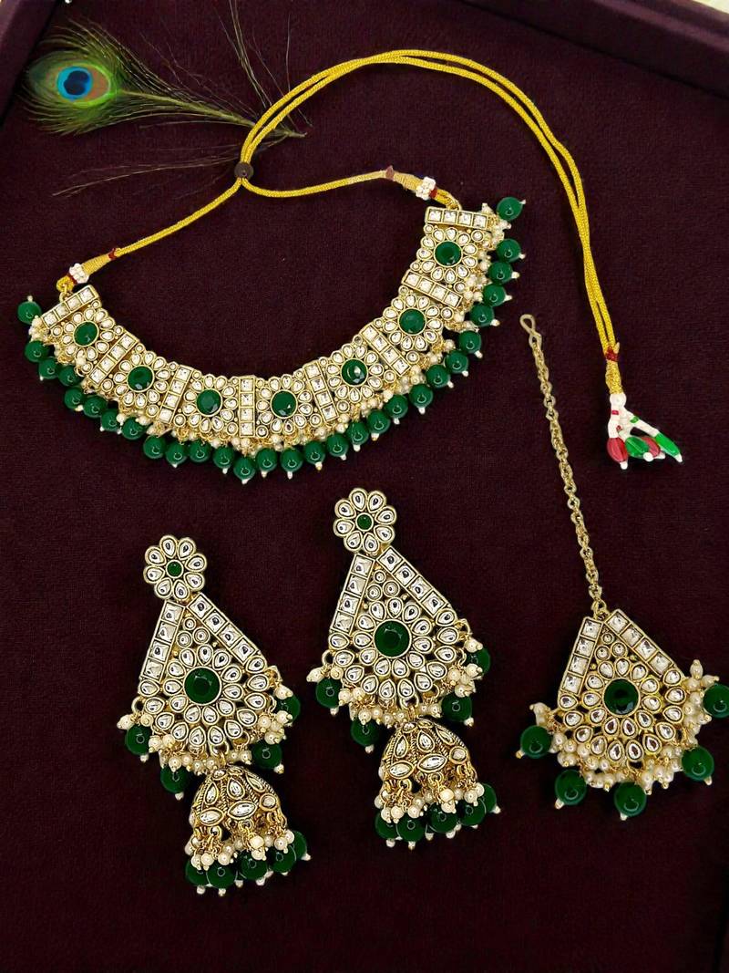 Gold toned floral design choker est, studded with green stone, kundan and beads. Secured with drawstring closure. A pair of matching jhumka earrings, Secured with post and back closure. A matching maang tikka. Secured with s hook closure.