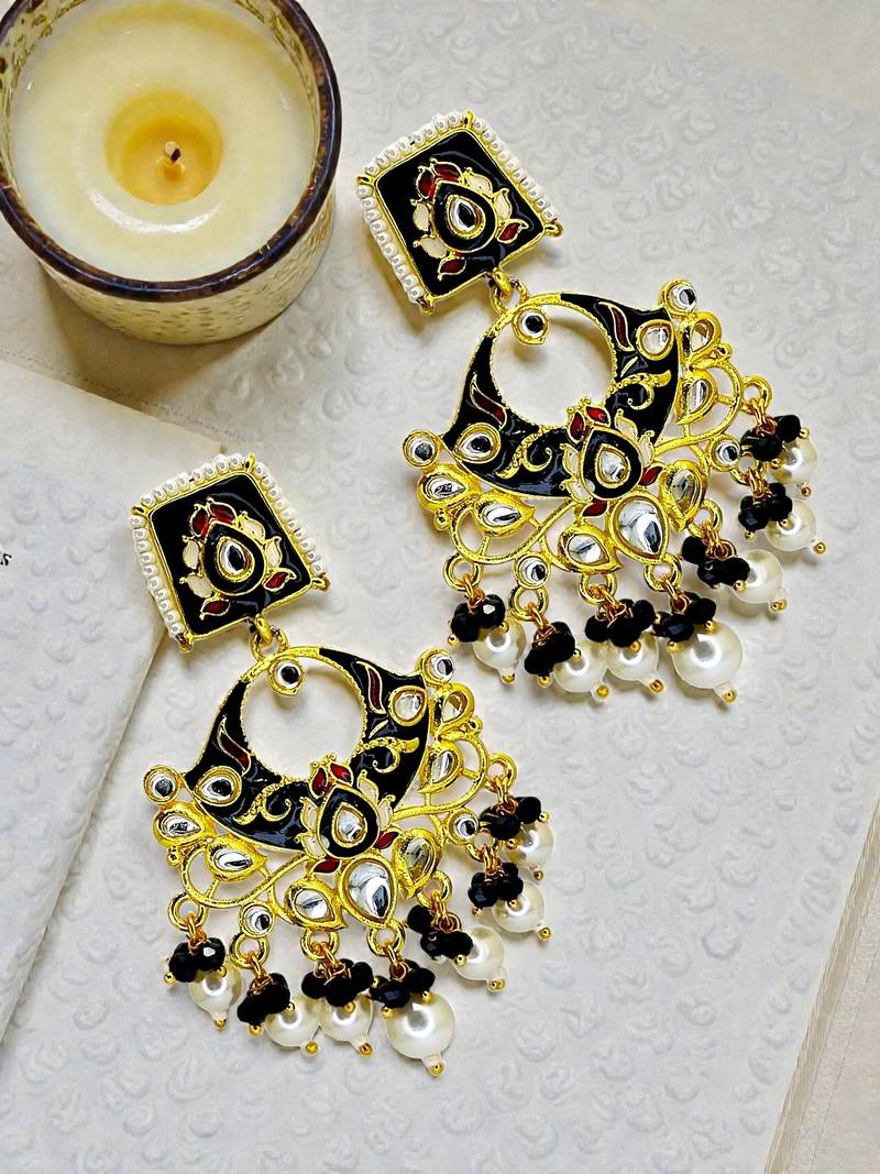 • Product Id : 4698624 • Package Details : 1 Pair Of Earrings • Type : Earrings • Occasion : Wedding • Look : Fashion • Jewellery Work : Kundan • Color : Black • Plating : Yellow Gold • Base Material : Alloy • Piercing : Yes • Pearl Type : Na • Pearl Shape : Na • Care : Store Jewellery In A Zip Lock Pouch (Air Tight Pouch), Keep Away From Water Perfume And Other Chemicals And Clean It With Dry And Soft Cloth Payments [+]