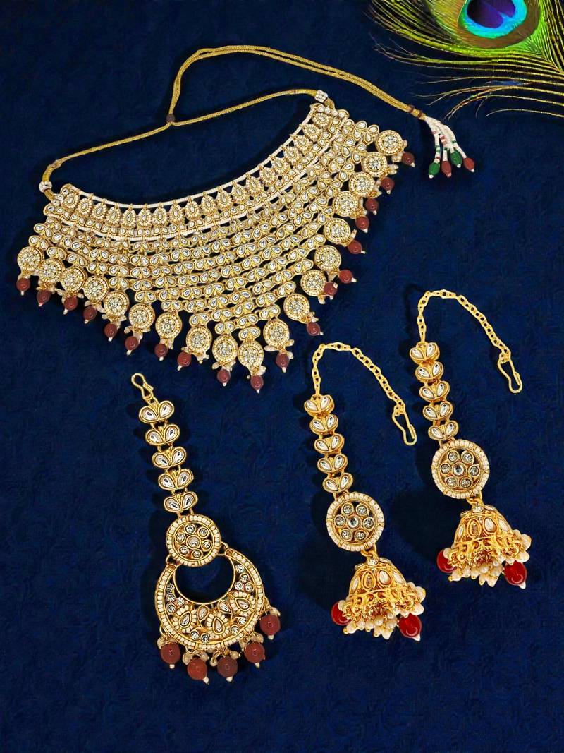 • Product Id : 4698695 • Package Details : 1 Necklace, 1 Pair Of Earring, 1 Maang Tikka • Type : Necklace Sets • Occasion : Wedding • Look : Contemporary • Jewellery Work : Kundan • Color : Maroon • Plating : Yellow Gold • Base Material : Alloy • Piercing : Yes • Pearl Type : Na • Pearl Shape : Na • Height : 12.5 • Width : 23.5 • Care : Keep Away From Perfume, Sweat, Water And Keep It In Airtight Plastic Container Payments [+]