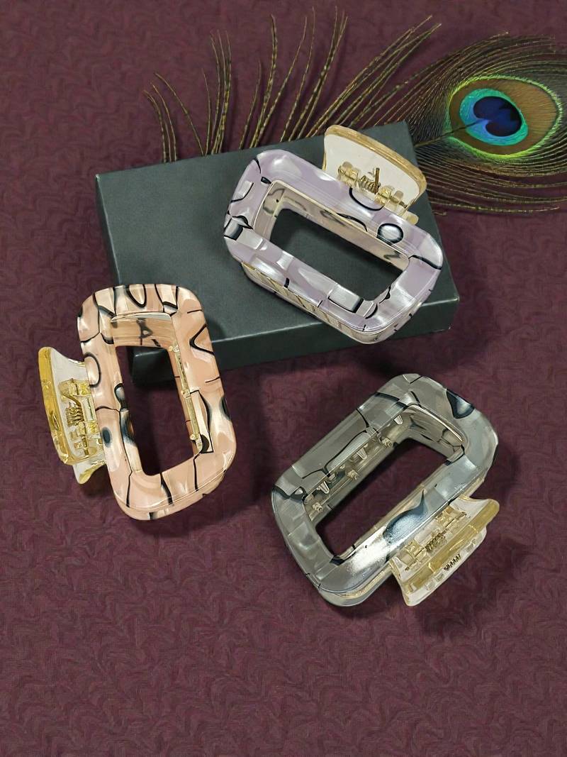 Set of 3 multicolor marble print rectanguler shape light lavender, peach and grey color hair claw clip clutcher, Secured with claw closure