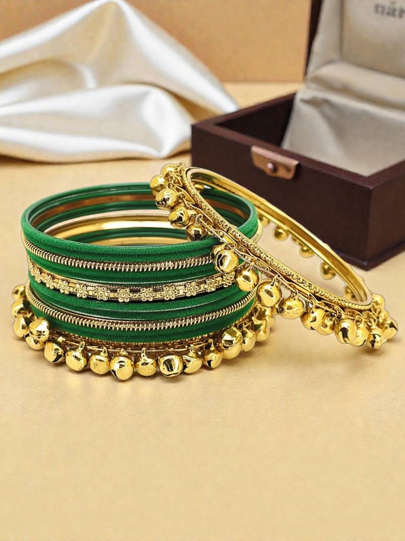 Set of 13 chuda set with set of 2 gold toned ghungroo studded kada bangle set, each secured with slip-on closure. set of 3 gold toned thin bangles, each secured with slip-on closure. set of 8 green velvet bangle set, each secured with slip on closure.