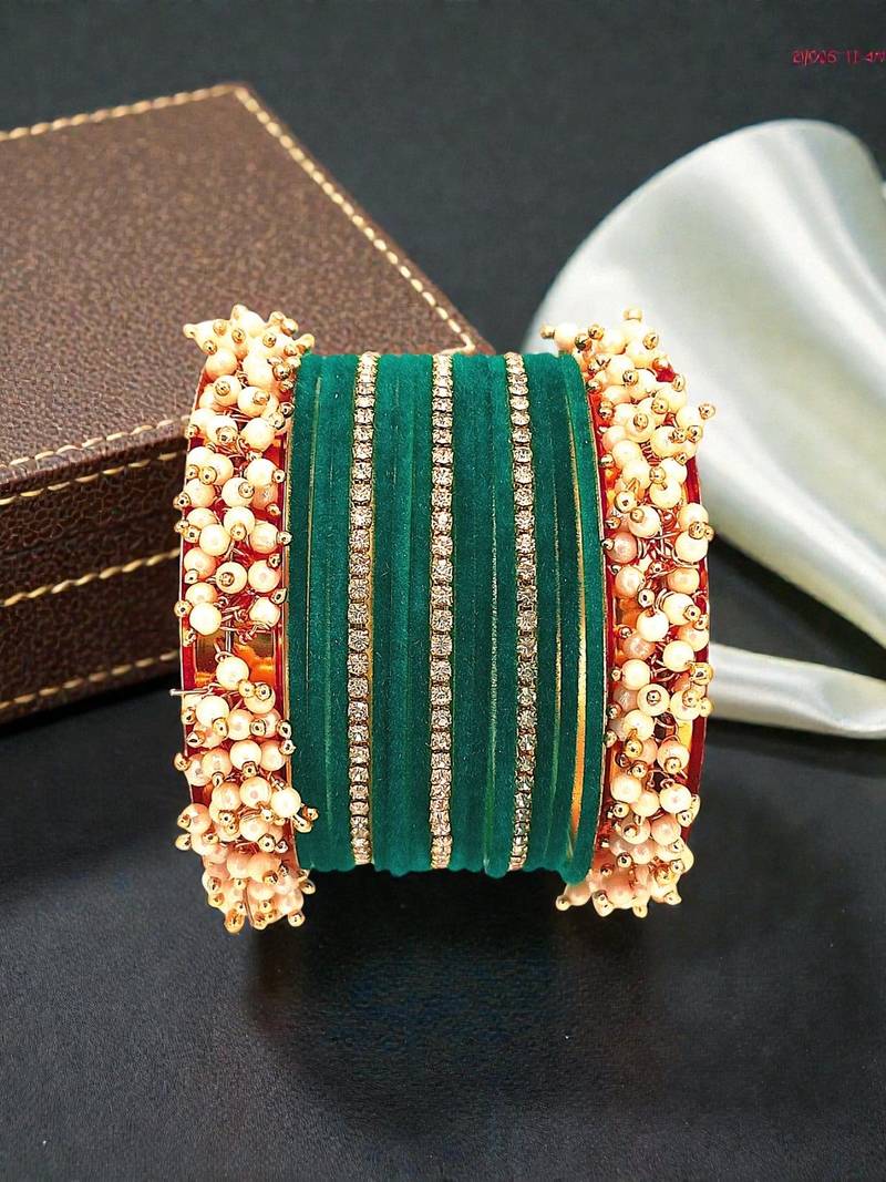Set of 17 chuda set with set of 2 gold toned beaded kada bangle set, each secured with slip-on closure. set of 3 gold toned cubic zircon studded thin bangles, each secured with slip-on closure. set of 12 green velvet bangle set, each secured with slip on closure.