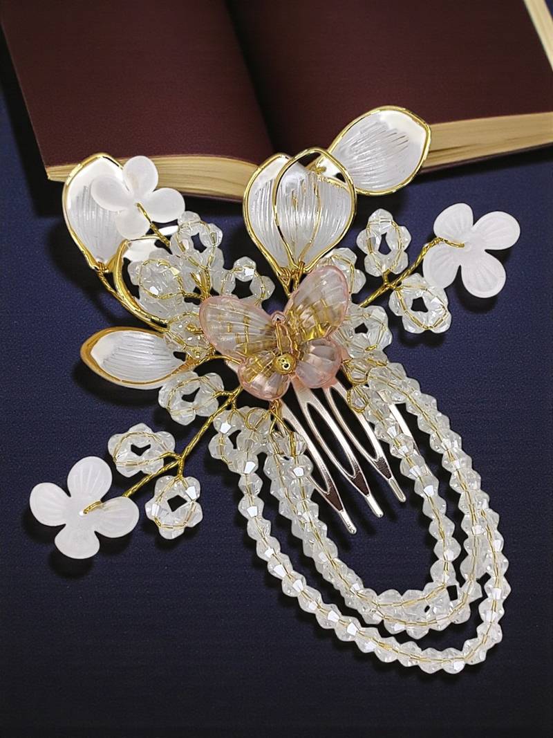 Silver toned baby pink color Floral Design comb hair pin, embellished with crystal beads and butterfly. Secured with insert closure