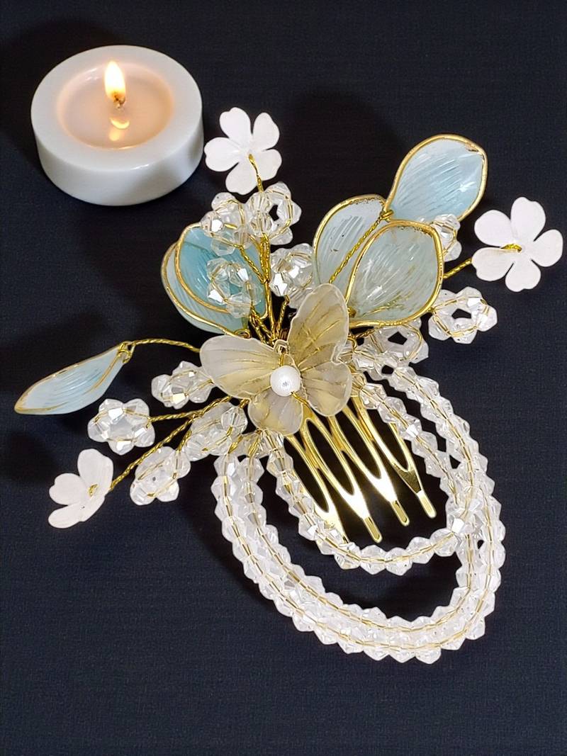Silver toned sky blue color Floral Design comb hair pin, embellished with crystal beads and butterfly. Secured with insert closure