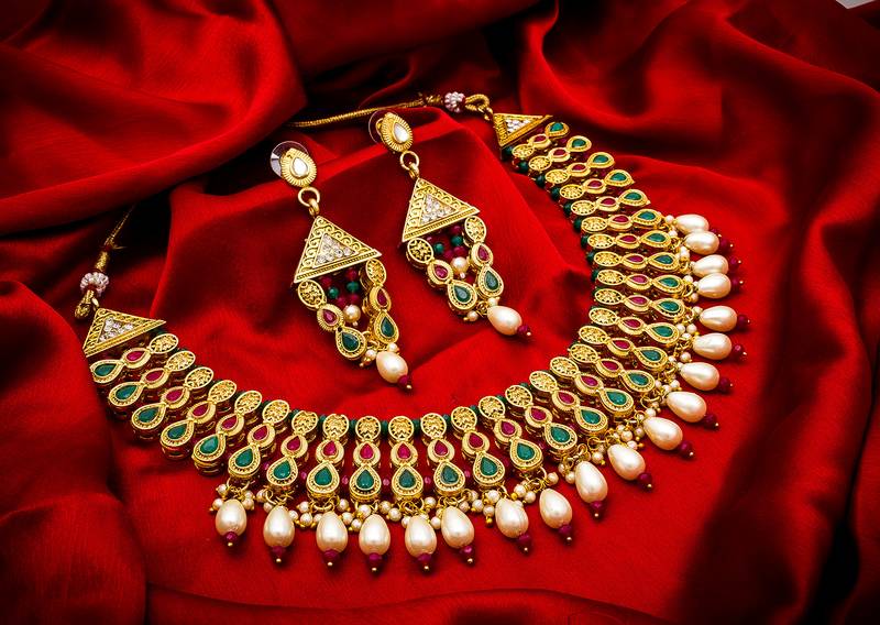 • Product Id : 3630938 • Package Details : 1 Necklace / 1 Pair Of Earrings • Type : Necklace Sets • Occasion : Bridal • Jewellery Work : Gold Plated • Color : Multicolor • Plating : Yellow Gold • Base Material : Alloy • Width : 4 Payments [+]