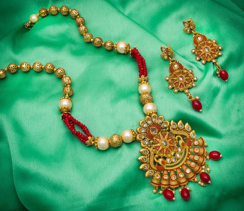• Product Id : 3630799 • Package Details : 1 Necklace / 1 Pair Of Earrings • Type : Necklace Sets • Occasion : Bridal • Jewellery Work : Gold Plated • Color : Multicolor • Plating : Yellow Gold • Base Material : Alloy • Width : 6 Payments [+]