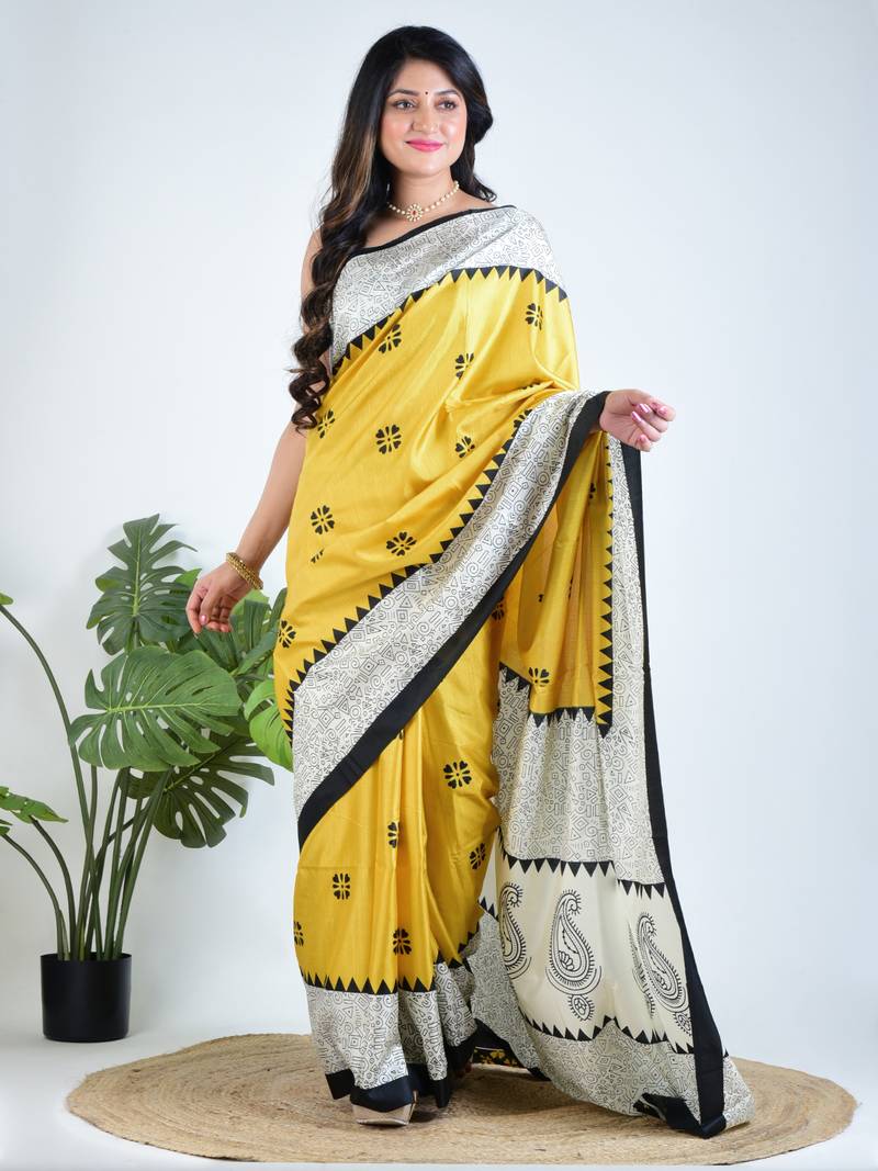 Yellow Printed Silk Unstitched Blouse Piece Elegant Traditional Saree