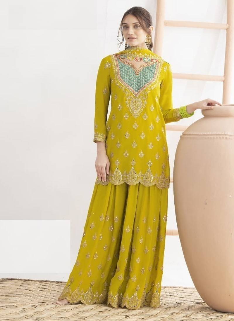 • Fabric : Santoon • Color : Lemon • Style : Palazzo • Color : Lemon Dupatta Details