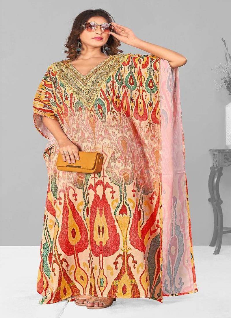 Multicolor Digital Printed Stone Work Polyester Crepe Kaftan Full Stitched Free Size