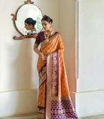 • Saree : Color- Orange / Fabric- Silk Blend • Blouse : Color- Purple / Fabric- Silk Blend Saree Details