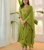 Aaysa Floral Embroidered Green Round Neck Pure Cotton A Line Kurta With Trouser & Dupatta