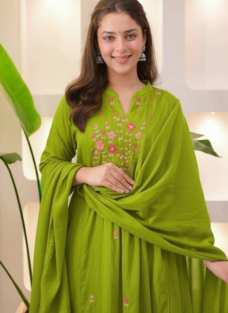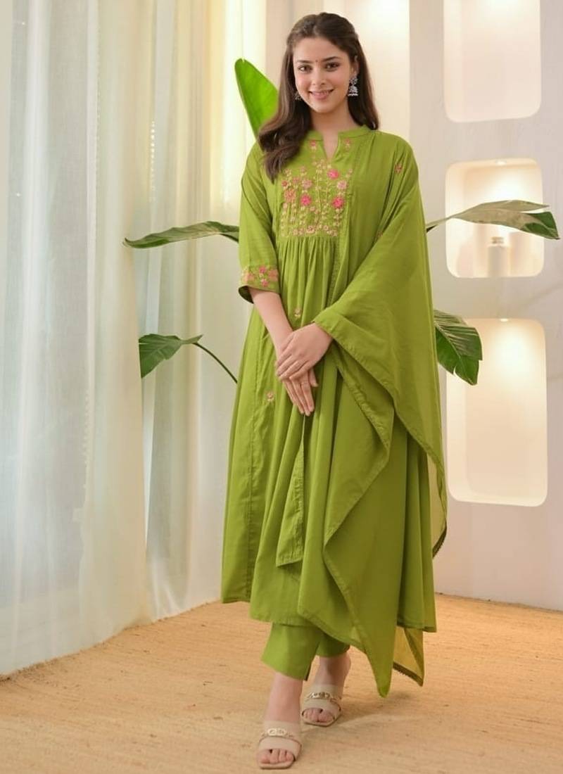 Bring a fresh, vibrant touch to your ethnic collection with the Aaysa Floral Embroidered Green Round Neck Pure Cotton A-Line Kurta Set. This stunning 3-piece ensemble is designed for comfort and elegance, making it perfect for both everyday wear and special occasions.