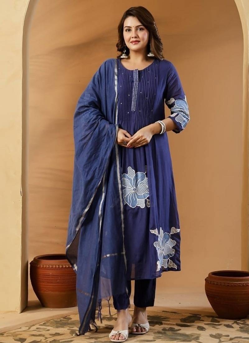 Blue Embroidered Round Neck Pure Cotton Kurta Trouser Dupatta Set