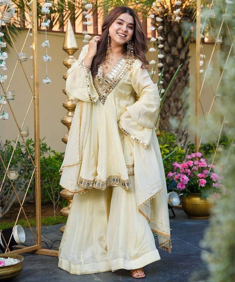 This kurta set brings together the richness of silk with intricate craftsmanship, making it a standout choice for any festive or traditional event. Its beige color exudes sophistication, while the mirror embellishments add the perfect amount of sparkle for evening functions.