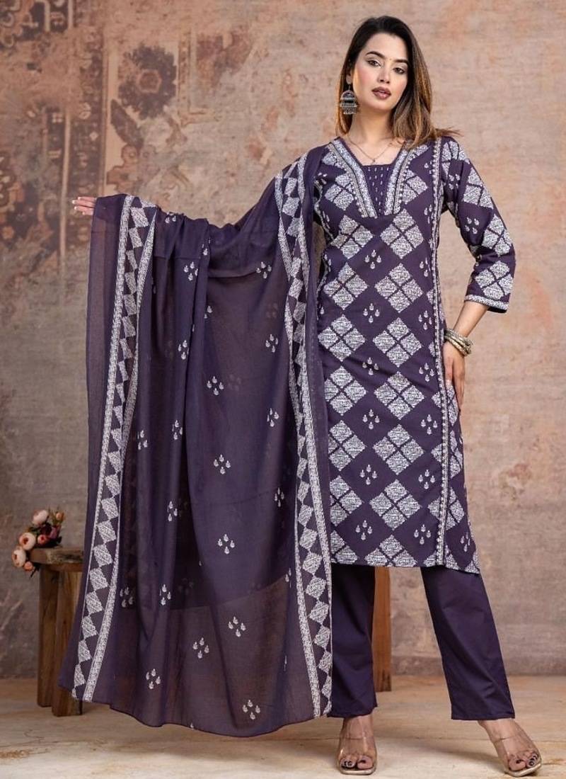 Crafted from lightweight cotton, this set includes a V-neck kurta, straight trousers, and a beautifully patterned dupatta.