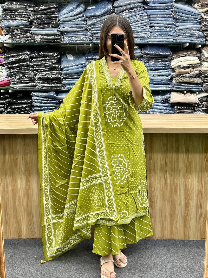 If you find the product for less we'll match it! Know MoreRefresh your ethnic wardrobe with this vibrant Lime Green Floral Embroidered Cotton Kurta Set. Featuring traditional white bandhani-inspired motifs, a beautifully embroidered neckline, matching palazzo, and a statement dupatta—this outfit is perfect for festive wear, summer styling, and daily elegance.