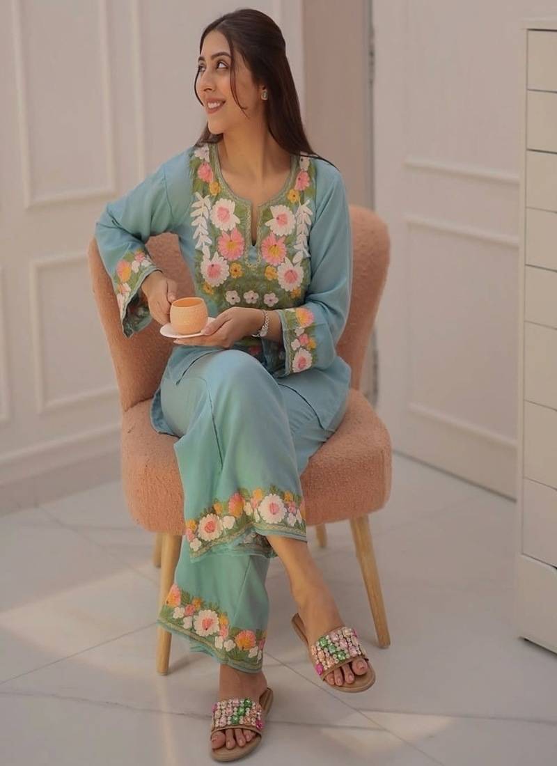 Floral Embroidered Pure Cotton Keyhole Neck Blue Co Ord Set