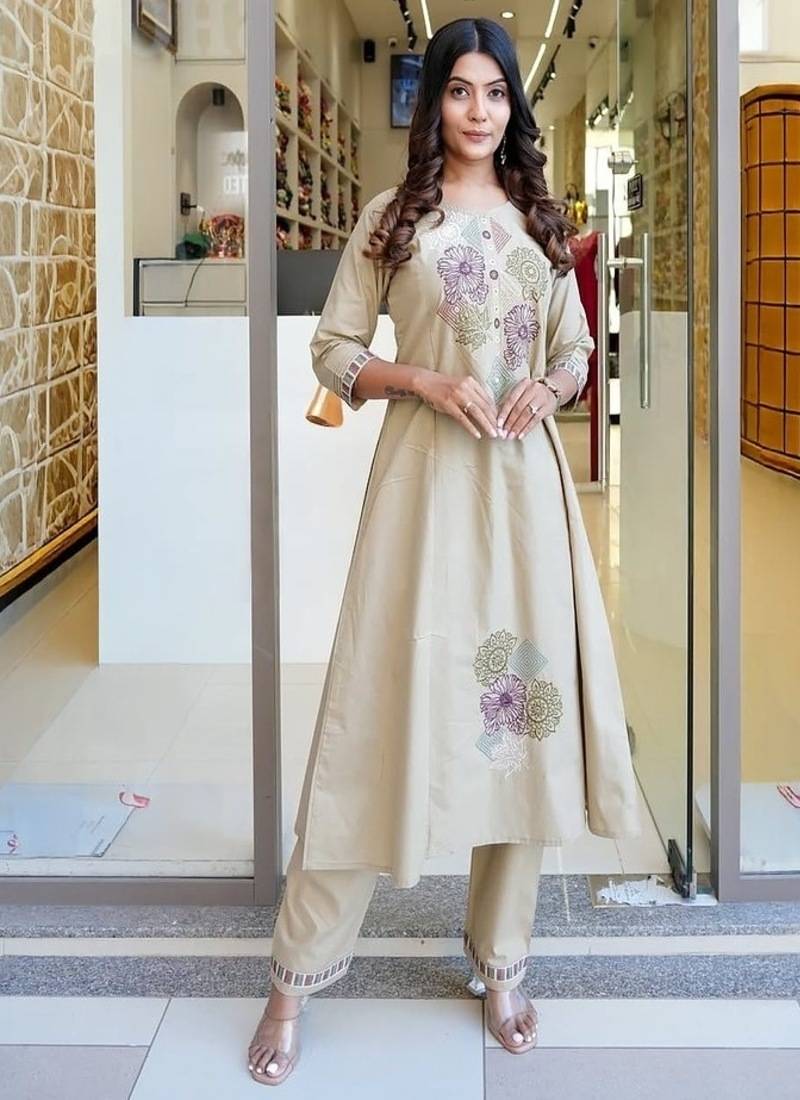 Floral Embroidered Pure Cotton Round Neck Beige Kurta & Trouser Set