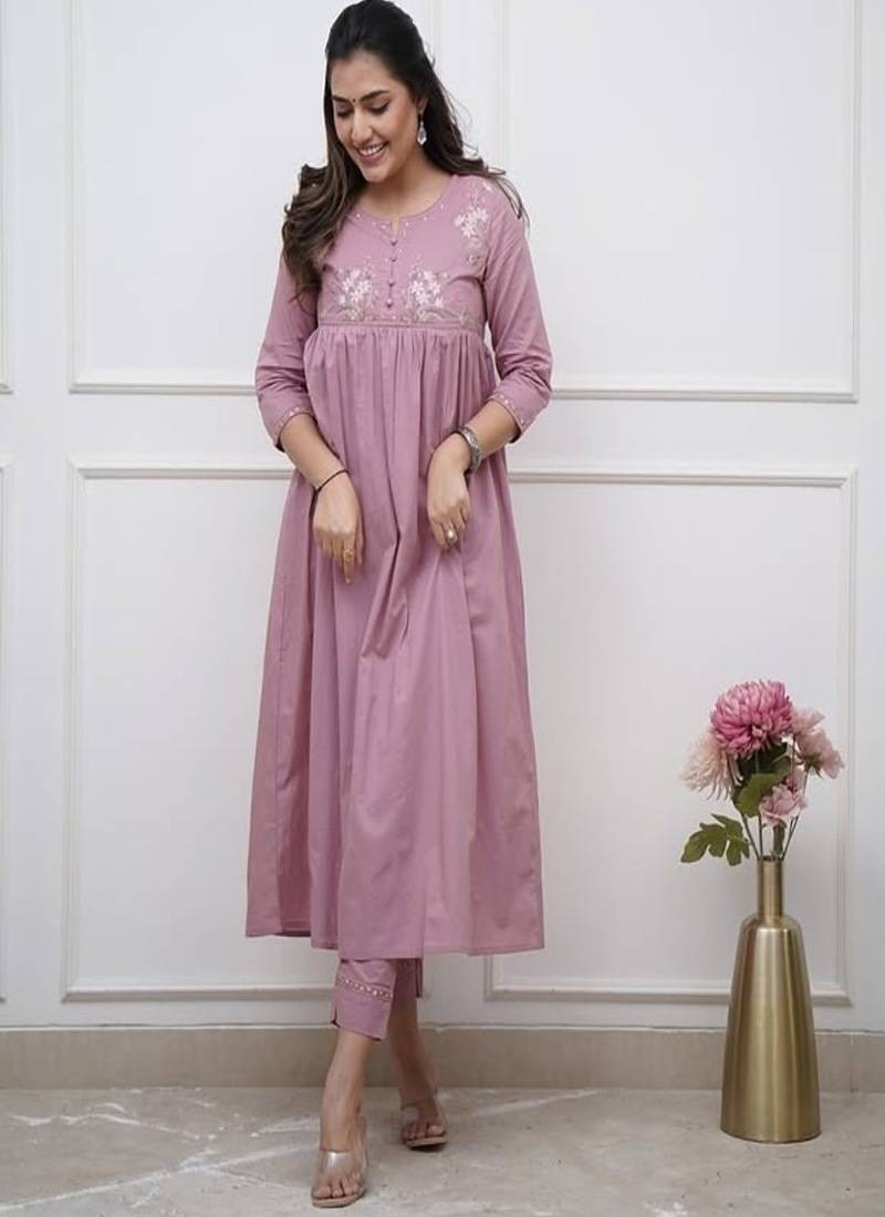 Lilac Embroidered Cotton Kurta And Pant