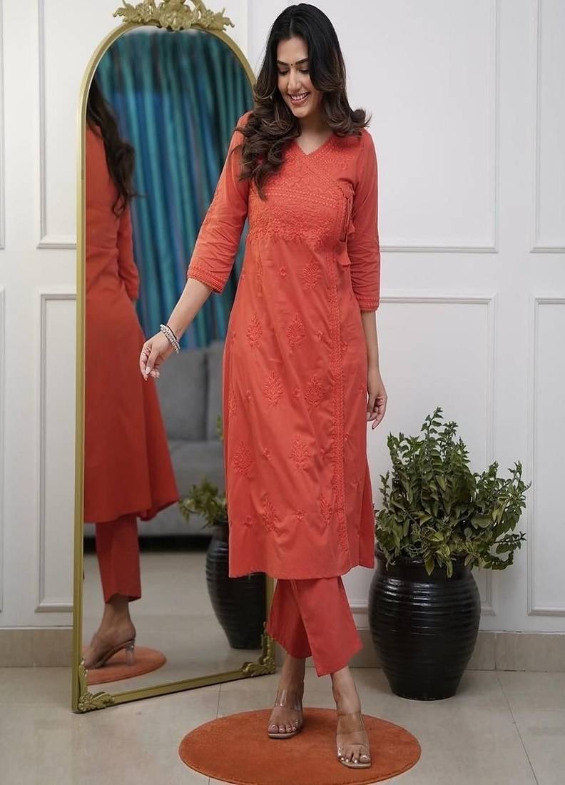 The kurta features a stylish V-neckline highlighted with delicate floral embroidery, adding a refined and feminine touch to the classic silhouette. Paired with a comfortable cotton trouser, this set offers a clean, coordinated look that is perfect for office wear, casual outings, festive gatherings, and daily wear.