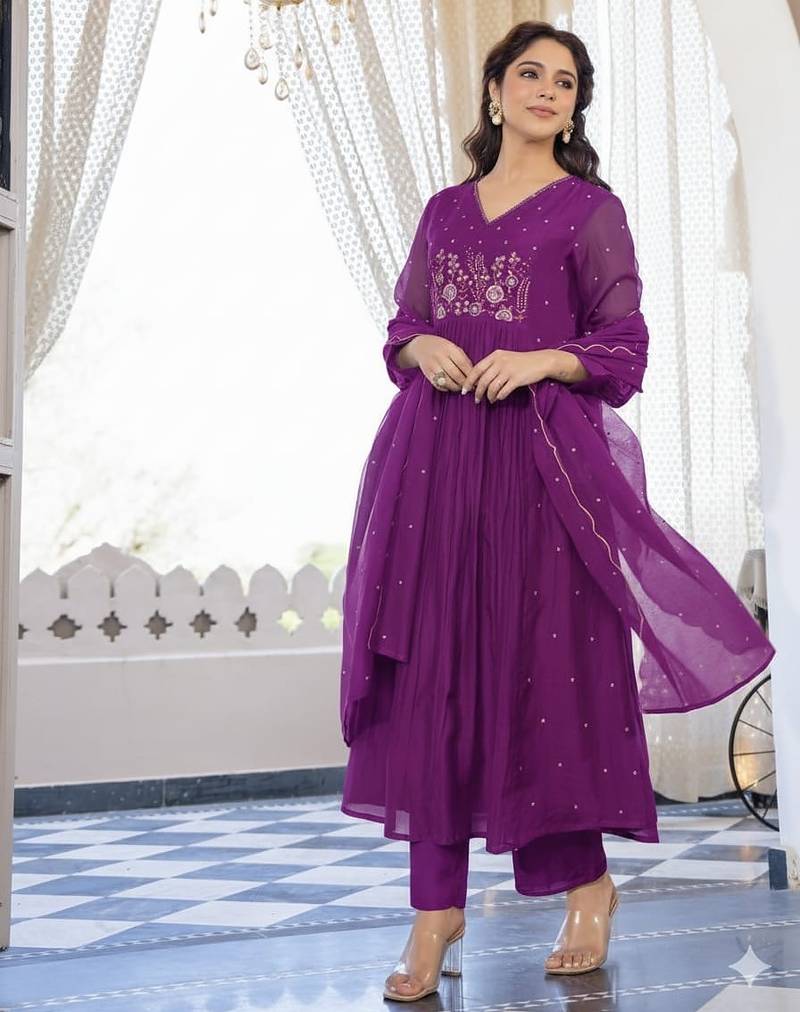 Floral Embroidered Purple V Neck Pure Cotton Kurta Set With Trouser & Dupatta
