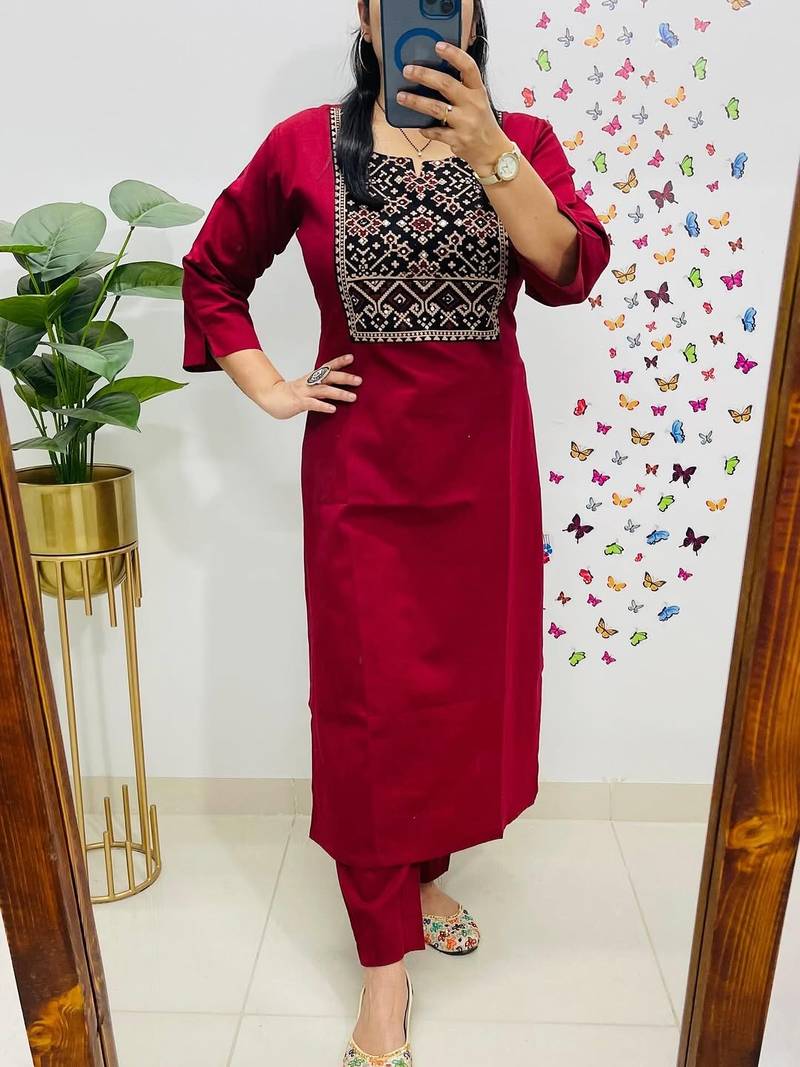 • Product Id : 4669056 • Package Details : 1 Kurta / 1 Trouser • Type : Kurta Sets • Region : India • Occasion : Casual • Fabric : Cotton • Work : Embroidered • Type : Hand Embroidery • Look : Fashion • Sleeve : Quarter Sleeve • Neck Style : Round Neck • Color : Red • Stitching : Stitched • Length : 44.0 General - Color and Texture may have slight variation. This happens because of photography.