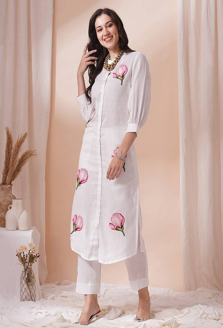 White Floral Embroidered Round Neck Cotton Kurta With Trouser