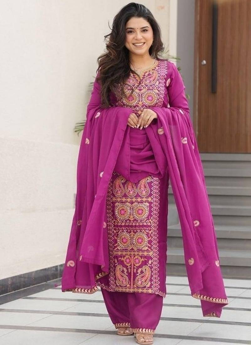 • Product Id : 4711741 • Package Details : 1 Kurta / 1 Trouser / 1 Dupatta • Type : Plus Size Kurtis • Region : India • Occasion : Casual • Fabric : Crepe • Work : Embroidered • Type : Hand Embroidery • Look : Fashion • Sleeve : Full Sleeve • Neck Style : Round Neck • Color : Purple • Stitching : Stitched • Length : 44.0 Payments [+]