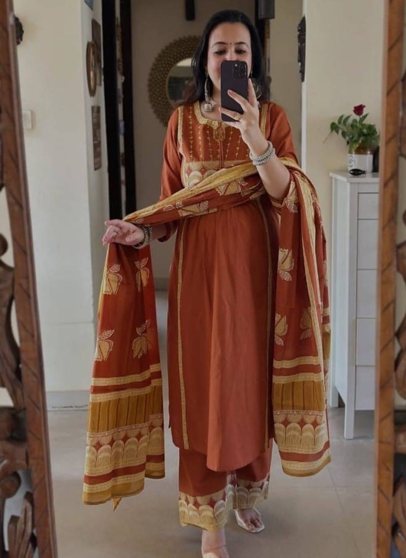 Floral Embroidered Round Neck Pure Cotton Kurta Trosuer & Dupatta Set