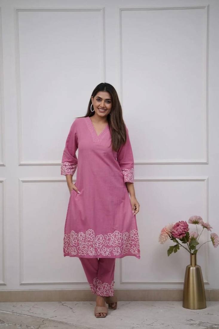 Pink Floral Embroidered Cotton Kurta With Trouser