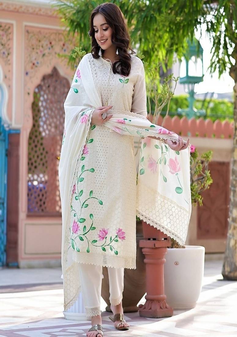 Floral Embroidered V Neck Pure Cotton Kurta Trosuer & Dupatta Set